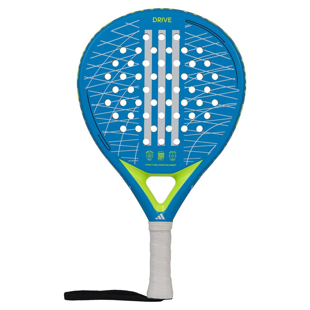 Pala redonda con balance bajo y punto dulce centrado Adidas Drive 3.3 Blue, ideal para jugadores principiantes que buscan un control excepcional. Planos y marco de fibra de vidrio y...
