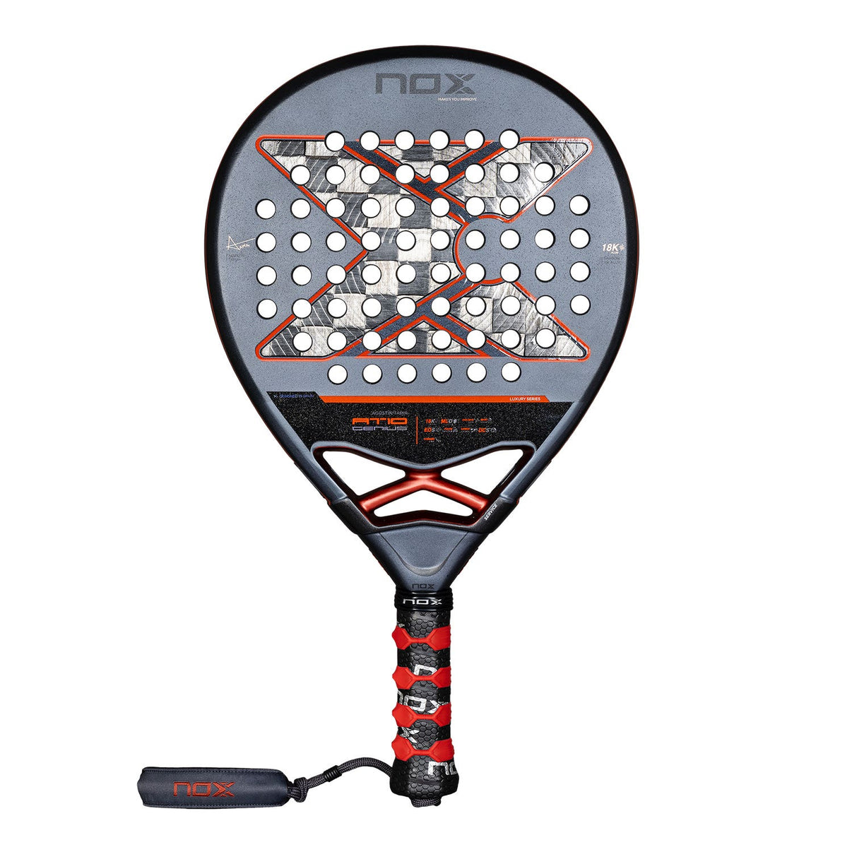 Pala de lágrima Nox AT10 Genius 18K By Agustín Tapia 2025, con núcleo multicapa de MLD Black EVA y planos rugosos de carbono aluminizado 18K para mayor durabilidad.